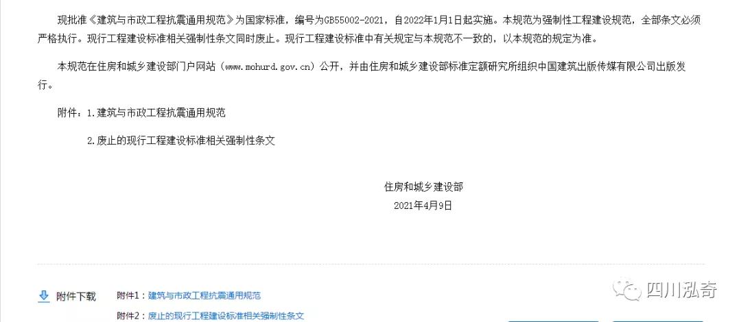 住房和城乡建设部于2021年7月15日发布了《建筑与市政工程抗震通用规范》GB55002 ,新规为强制性工程建设规范,全部条文必须严格执行。 将于2022年1月1日起实施。