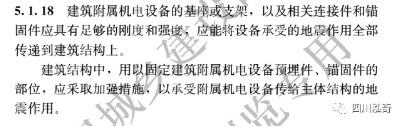 5.1.18 建筑附属机电设备的基座或支架,以及相关连接件和锚固件应具有足够的刚度和强度,应能将设备承受的地震作用全部传递到建筑结构上